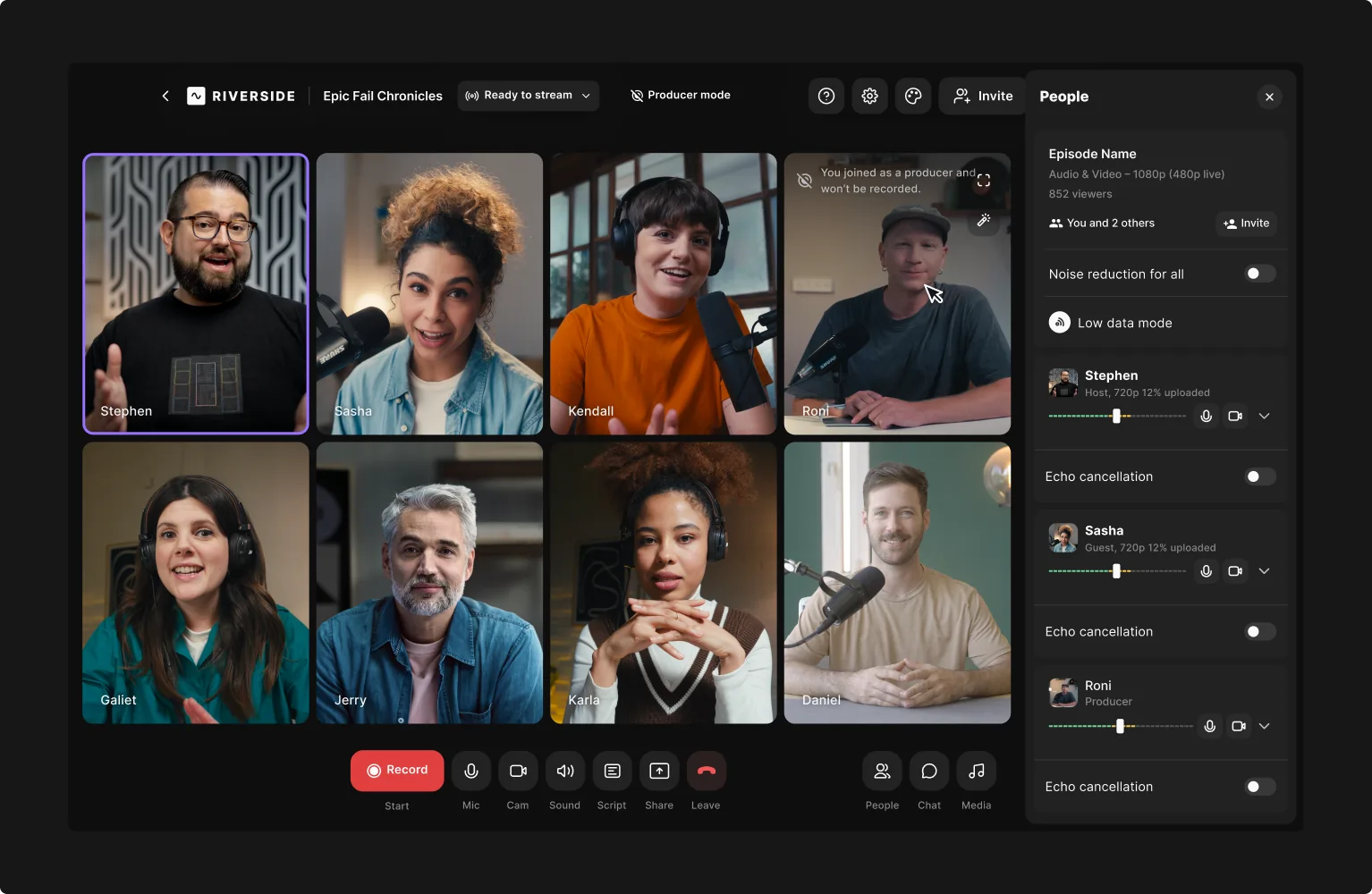 That’s where Riverside comes in - a browser-based software, Riverside locally records each of your participants and progressively uploads the recording to the cloud. That means you get studio-quality recordings of each and every one of you - no internet interference - and no risk of losing your data.