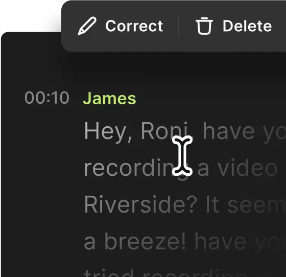 Verwende die quelloffene Zeitleiste von Riverside oder das automatische Transkript, um Aufnahmen in prägnante, schöne Inhalte zu verwandeln. Es gibt viel KI, die integriert ist, um Dinge zu beschleunigen, aber es gibt keinen Bedarf mehr, Dateien herumzuschieben.