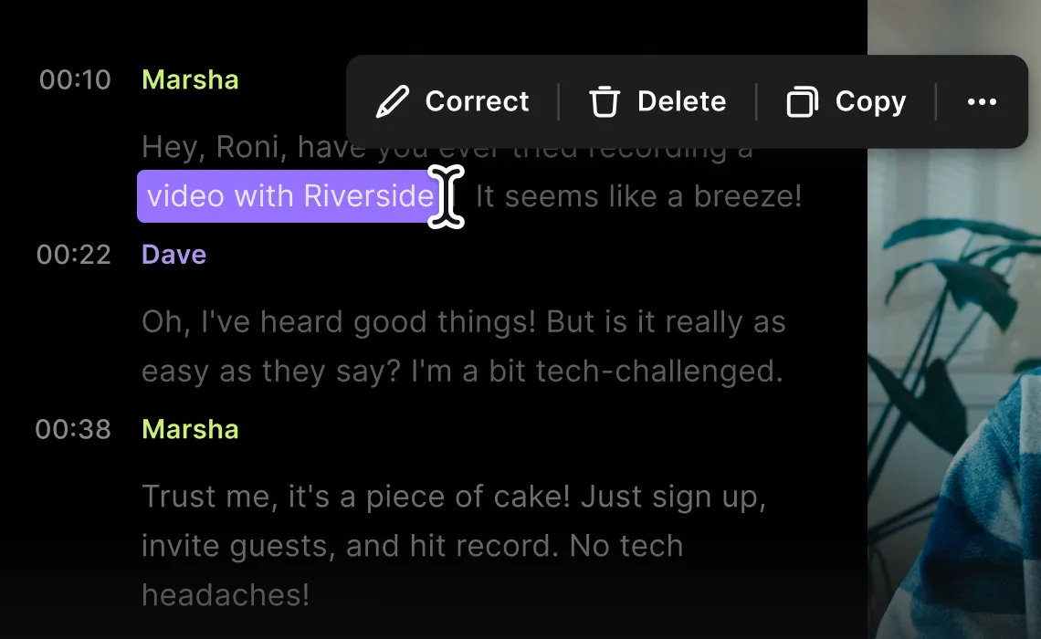 Bearbeite deine Aufnahmen direkt im Transkript – suche, lösche, kopiere und füge ein. Ganz ohne komplizierte Tools oder Einarbeitung.