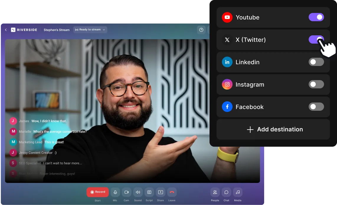 Stream in Voll-HD 1080p zu jedem Ziel. Alles von einem vollständig markierten Live-Studio aus, in dem Du mit Deinem Publikum chatten und sie einladen kannst, anzurufen.