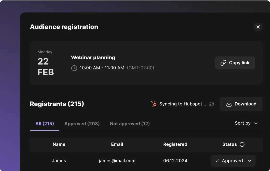 Plane eine Zeit und ein Datum, sende Einladungen an Gäste und Publikum, verfolge neue Anmeldungen direkt dort oder in Deinem CRM. Und genau so ist Dein Event eingerichtet.