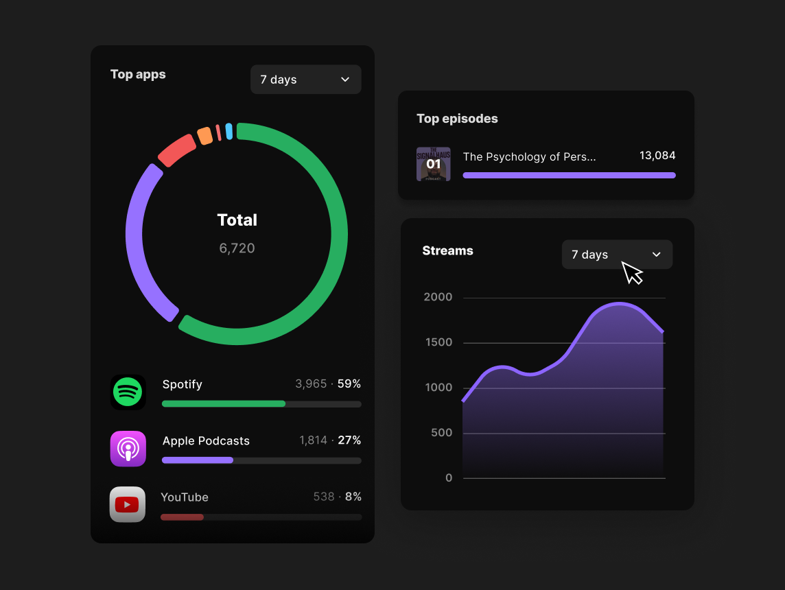 Get clear insights into your podcast performance, episode success, and audience behavior with built-in, simple analytics.