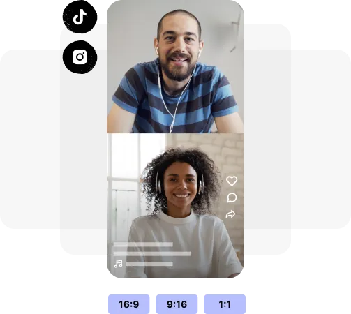 Transform your long-form recording into bite-size clips with a single click. AI will automatically identify your best moments and clip them out for you to continue customizing them as you like with different layouts, sizes, backgrounds, captions, and more.