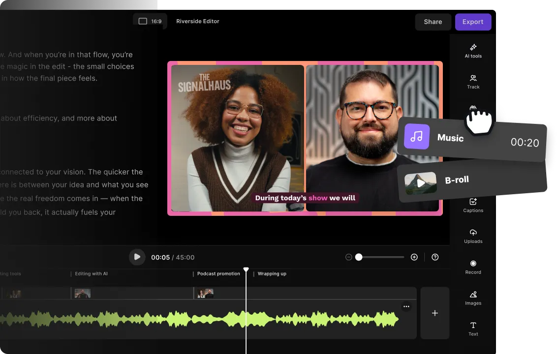Everything you need to turn your recording into engaging content. Edit with text or timeline. Then, touch up with music, b-roll, captions and branding.