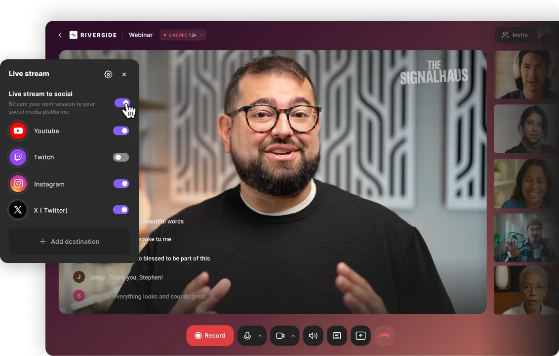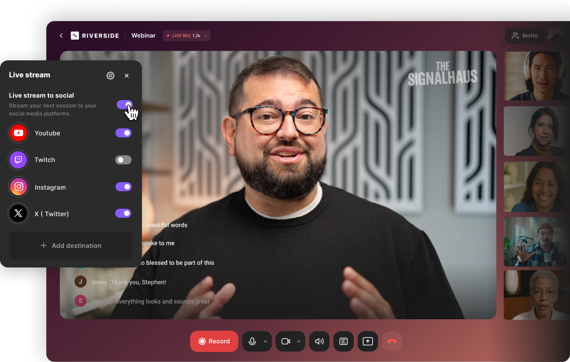 Stream to YouTube, Facebook, Instagram, and LinkedIn, all at once. Brand your studio, invite viewers to call-in, and repurpose your stream.