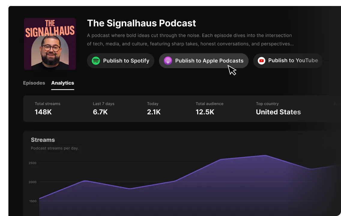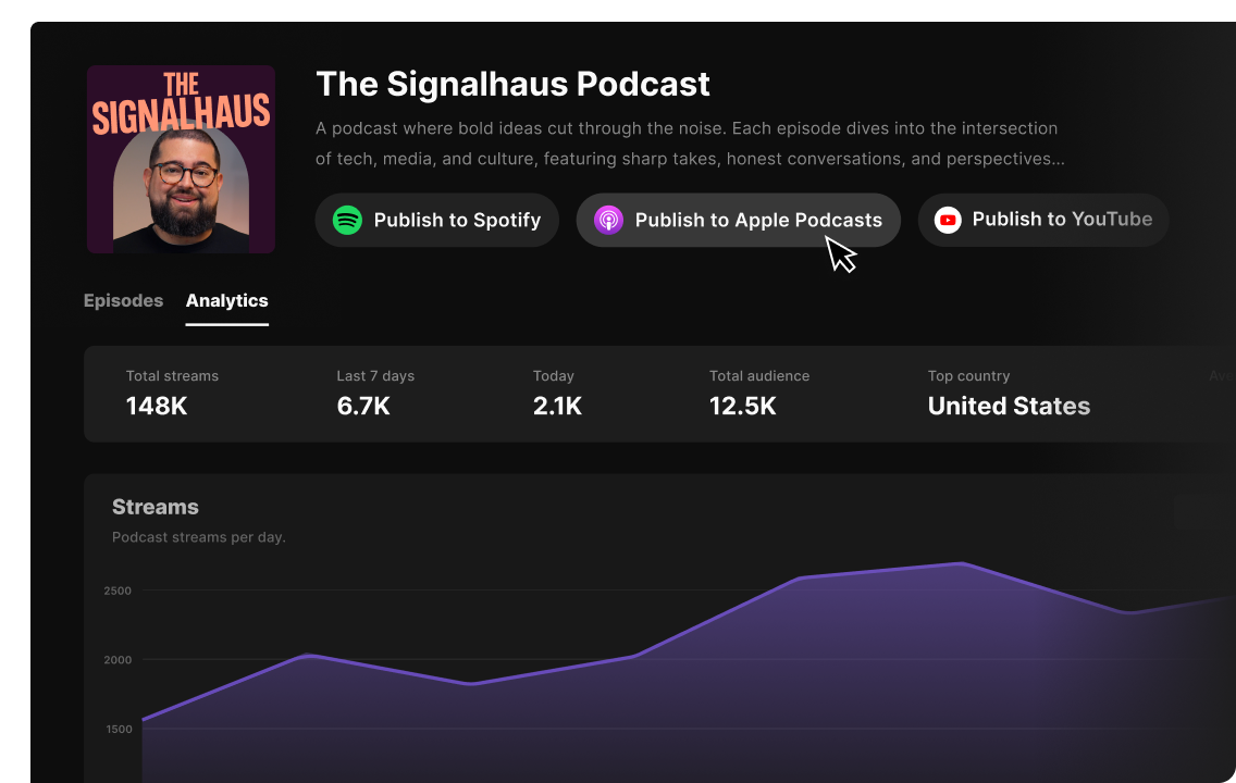 No platform hopping. Publish to YouTube, Apple Podcasts, and Spotify right where you record. Add episode covers, track analytics, and schedule posts.