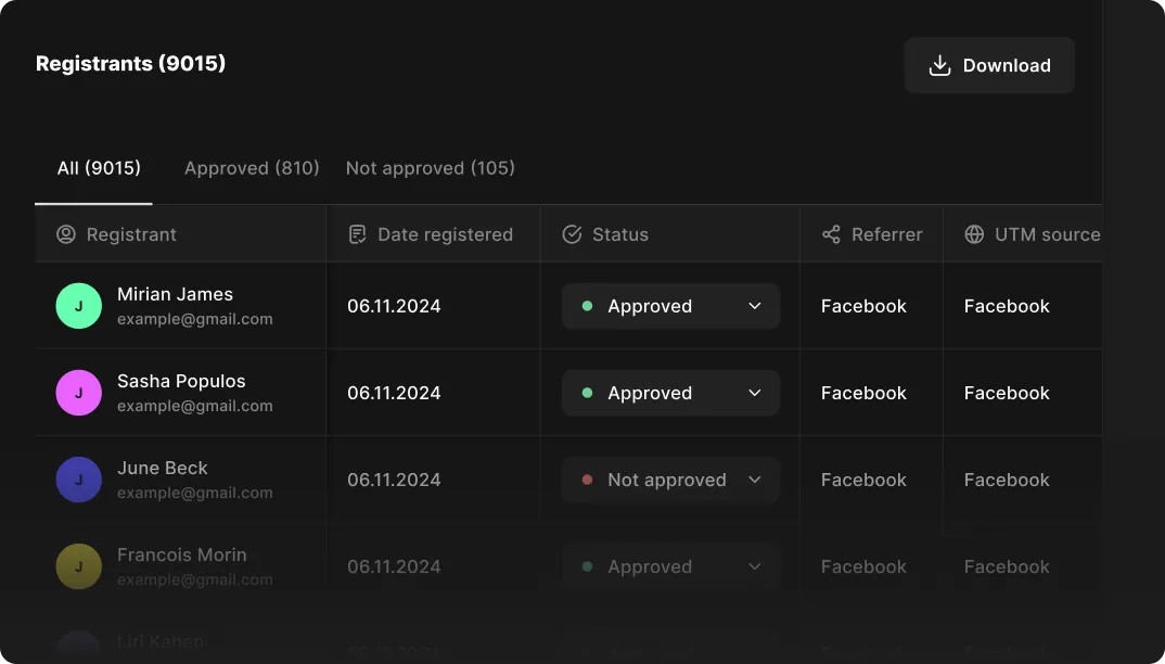 Track registration source and watch time. Export as CSV and sync to HubSpot.