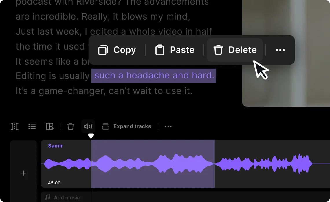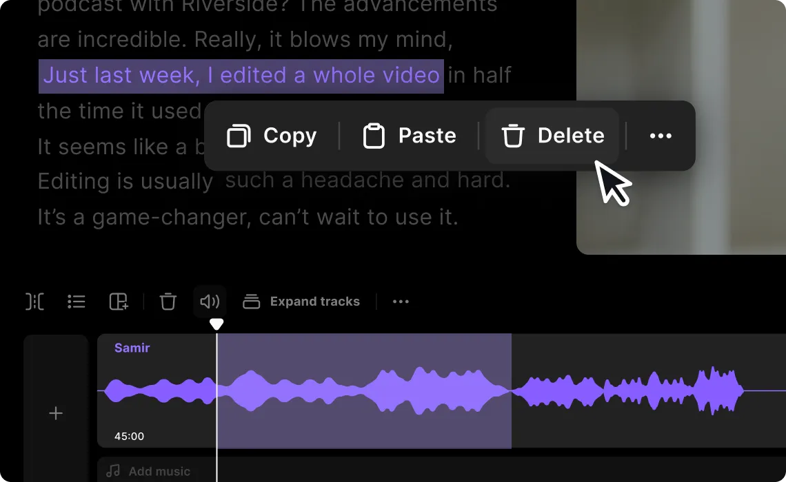 Edit your recording just like a doc—search, delete, copy, and paste right in the transcript.