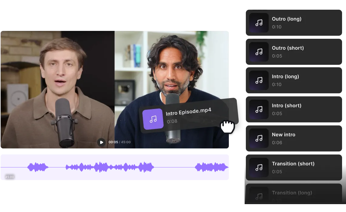 Add an intro, outro, and music from Riverside’s royalty-free library or upload your own.
