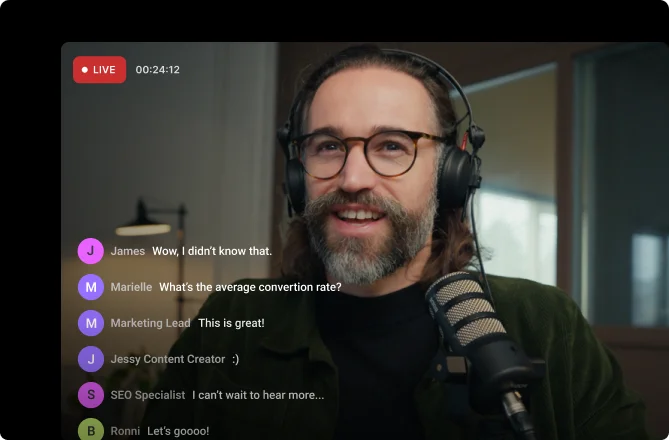 Bring viewers on live or take questions in the chat. Share your screen for quick tutorials, and record each speaker in high-quality, separate tracks, ready for creating on-demand lessons.