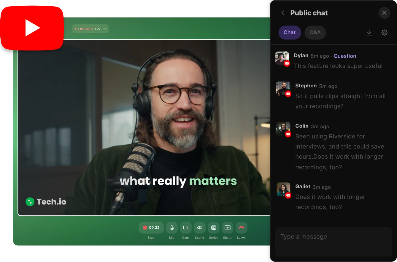 Stream to YouTube and other platforms like LinkedIn, Facebook, and Instagram, all at once. With our omnichat, all your audience conversations stay in one place, so you never miss a message.